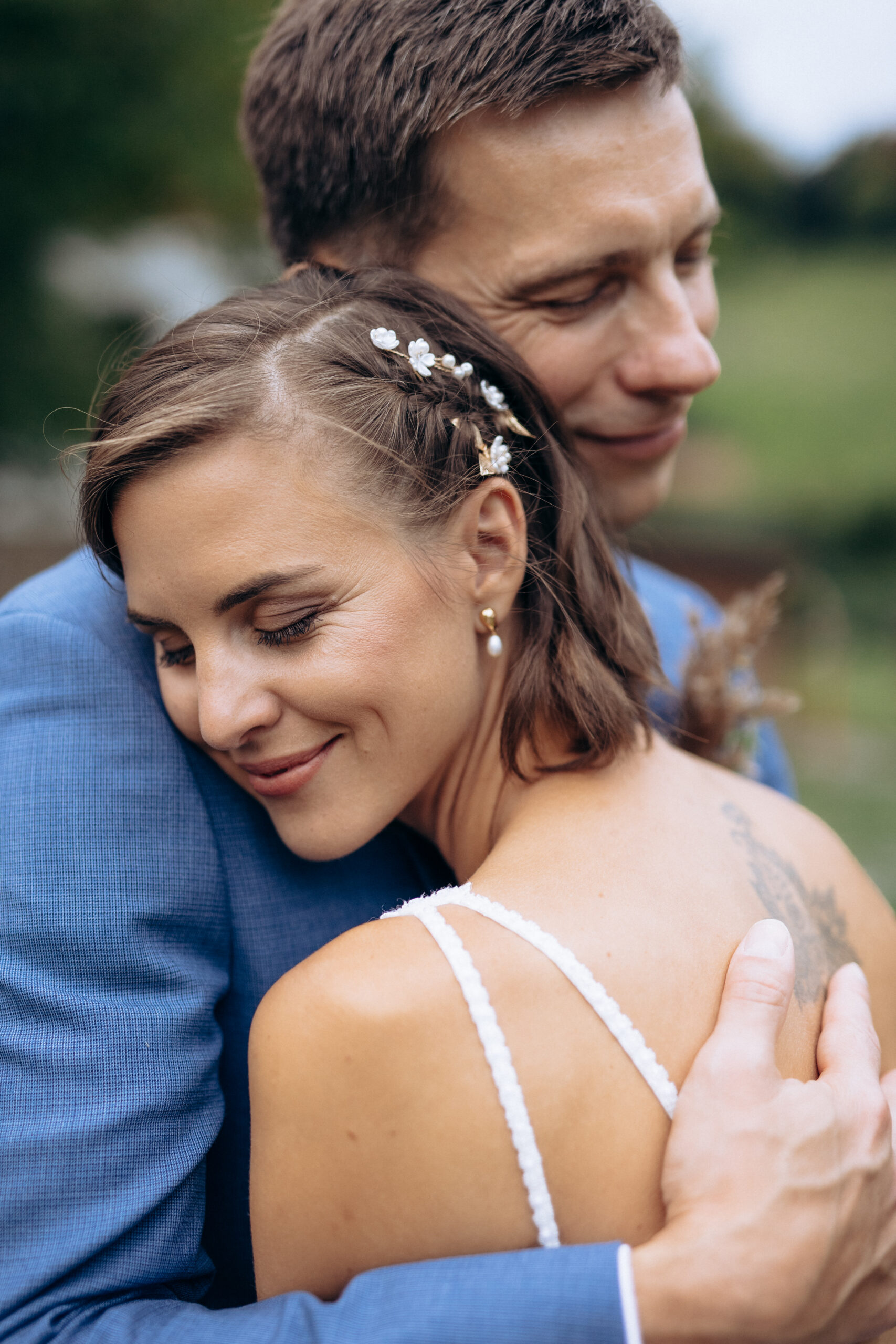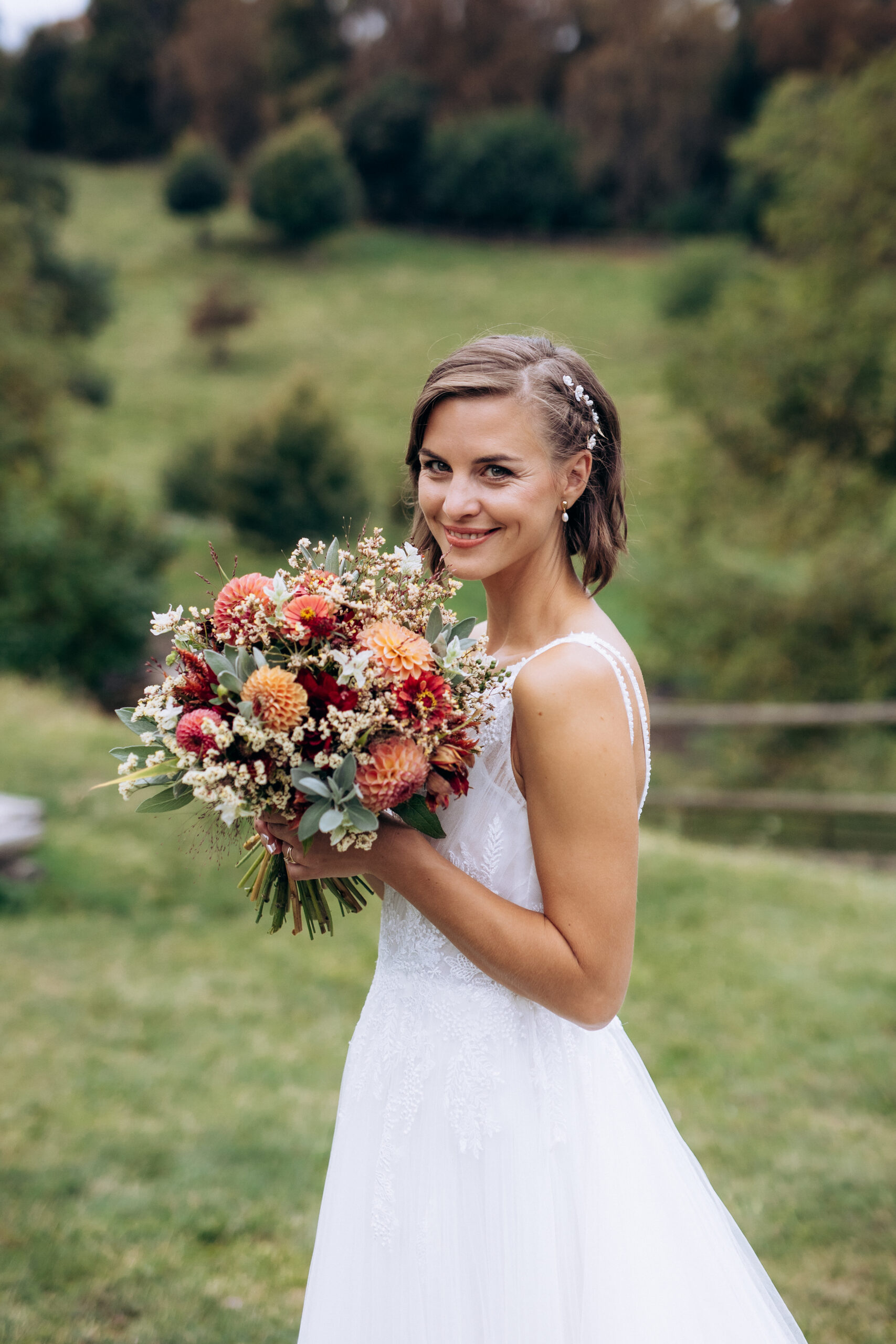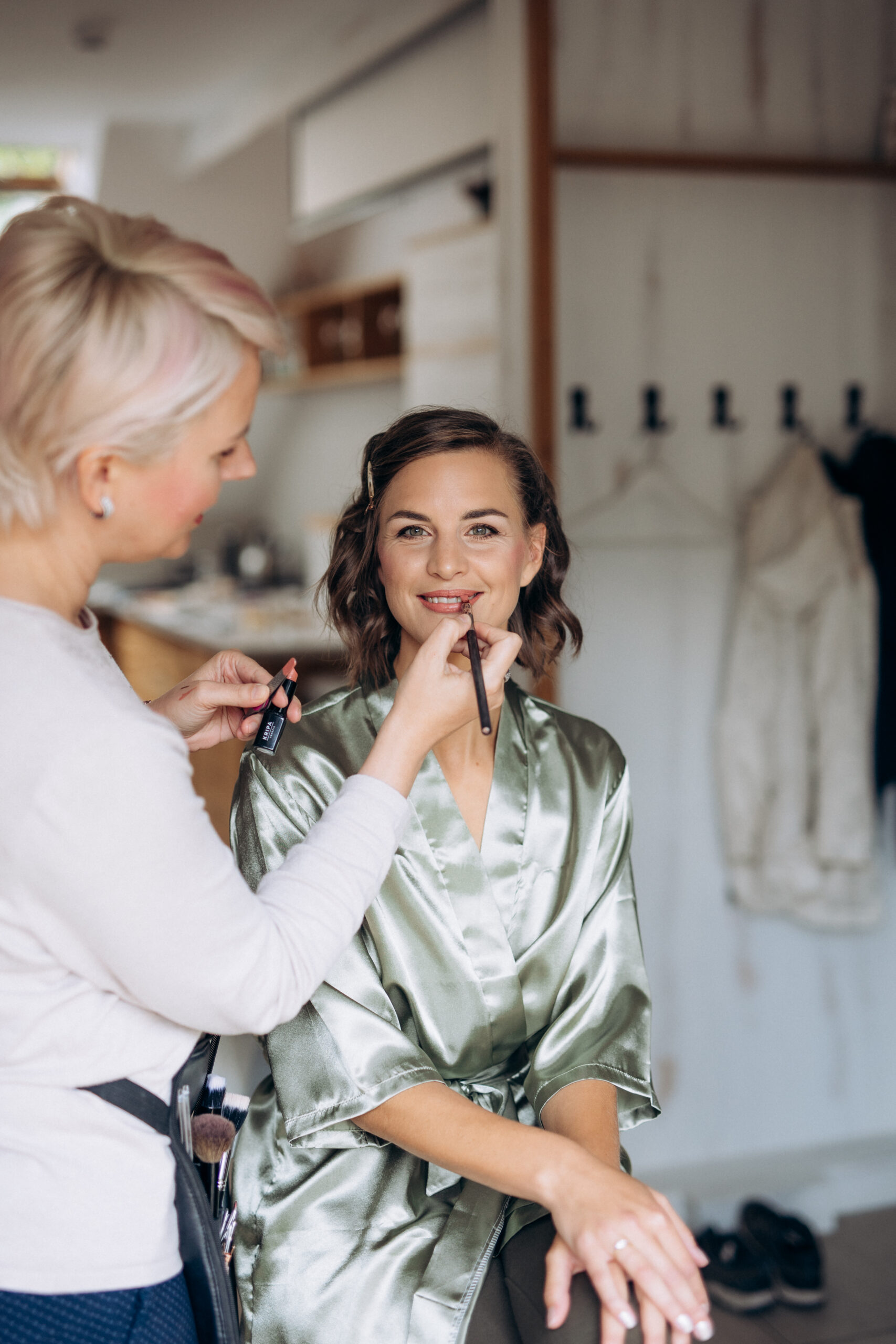 - Make-up je lépe provádět, až je nevěsta učesaná, s nevěstou zůstávám až do oblečení šatů, s čímž v případě potřeby ráda pomohu, popř. doladíme malé nedokonalosti na dekoltu.
